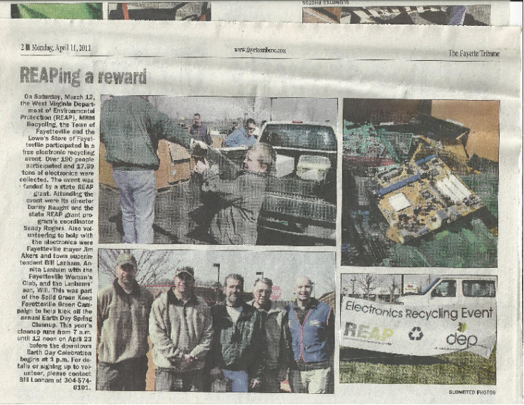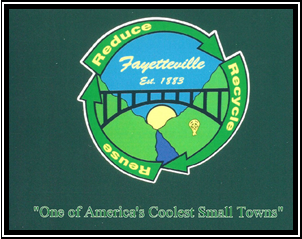 Over the past few years, Fayetteville has taken the initiative to Go Green! If you haven’t already, we hope that you will join with us to make a difference! Take your recyclables to the bins at one of two convenient locations (Ben Franklin’s or Wal-Mart). We are now accepting plastic #1 & #2 at Walmart and Studio B on Keller Avenue. For more information call (304)574-0917 or town hall, (304)574-0101 |